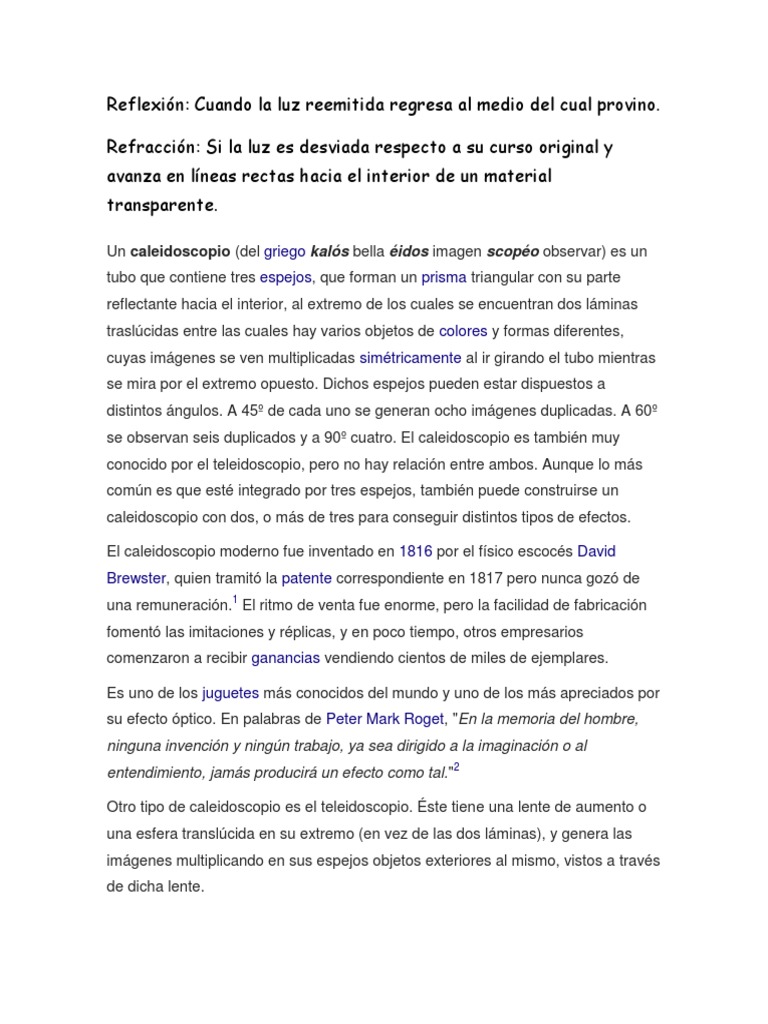 El caleidoscopio es un juguete que utiliza luces y espejos para reflejar objetos y crear patrones. Girando la pieza que hay al final del caleidoscopio las formas van cambiando dando un resultado hipnótico y espectacular. Un caleidoscopio del griego kalós bella éidos imagen y scopéo observar es un tubo que contiene tres espejos que forman un prisma triangular con su parte reflectante hacia el interior al extremo de los cuales se encuentran dos láminas traslúcidas entre las cuales hay varios objetos de colores y formas diferentes cuyas imágenes se ven multiplicadas simétricamente al ir. El telescopio más familiar es el llamado telescopio óptico que utiliza una serie de lentes o un espejo curvado para enfocar la luz visible. El Caleidoscopio es el túnel para mundos mágicos donde las formas no están reglamentadas un campo donde el juego y el color se meten tranquilamente en el cerebro del observador que queda cautivado para siempre y que si repite es porque entendió el mensaje. El teleidoscopio un caleidoscopio diferente. En una punta tendremos el Foco lente de entrada de la luz del astro y luego tendremos un espejo muy pulido en el fondo polo opuesto que reflejará la imagen.